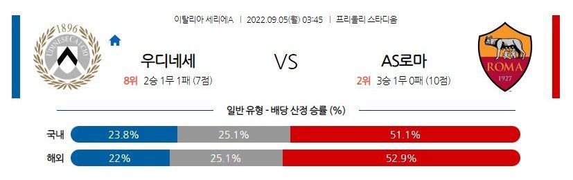 로마 승 / 언더(2.5 기준)를 추천한다. 위에 서술했듯이 우디네세의 1-2선 자원들이 로마의 철옹성 같은 수비진을 뚫어낼 가능성이 현저히 떨어진다. 특히 안정적인 수비진을 바탕으로 디발라(FW), 에이브러햄(FW)등 꾸준한 득점 생산력을 고려할 때 로마의 무난한 승리가 예상된다. 단 상위전력임에도 내려앉는 수비 스탠스를 유지하는 무리뉴의 전술 특성을 고려해 언더를 필히 겸하자.