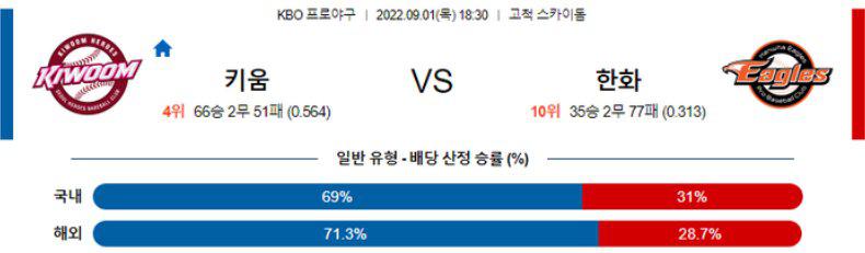 키움의 승리를 점치겠다. 롯데와의 2연전에서 타선이 활약하면서 유종의 미를 확실하게 거두었고, 안우진의 최근 페이스도 상당히 믿을만한 수준까지 올라와 있다. 장민재의 안정성도 한화 입장에서는 든든한 자원이지만 이닝 소화력에서는 확실하게 안우진보다 열세고, 한화의 고질적인 약점인 불펜에 과부하가 이어질 가능성도 적지는 않다. 선발 투수들의 장점을 고려한다면 경기 흐름이 투수전으로 이어지면서 기준점을 충족하기는 어려울 가능성이 높다.