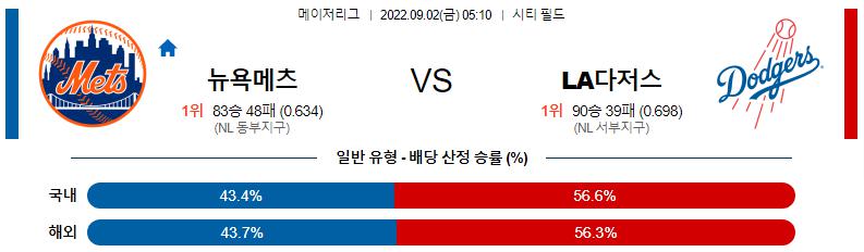 9월 2일 05:10 MLB 뉴욕메츠 : LA다저스 MLB분석