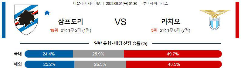 라치오는 직전 인터밀란과의 홈 경기에서 3대1로 승리하였다. 토리노와의 경기에서 충격적인 무승부를 기록하였던 라치오는 자신들의 경기력을 찾아냈다. 무엇보다 부진하던 안데르손이 골을 기록하는 활약을 보인 부분이 상당히 반갑다. 라치오가 좋지 못한 모습을 보인 부분은 아무래도 공격진의 문제점이였다. 이번 시즌 기대를 모으고 있는 자카니는 계속해서 부진한 모습이다. 직전 경기 페드로가 교체로 들어가 활약을 보인 부분은 그나마 기대요소가 될 수 있다. 임모빌레의 활약이 이어질 가능성이 높지만 안데르송과 자카니의 활약이 이어지지 못한다면 이번 경기도 공격에서의 답답함이 이어질 수 있다. 특별한 부상자가 없다는 점은 기대를 가져 볼 수 있다. 삼프도리아 원정 경기에서는 최근 5경기 4승 1패로 강한 모습을 보였다.