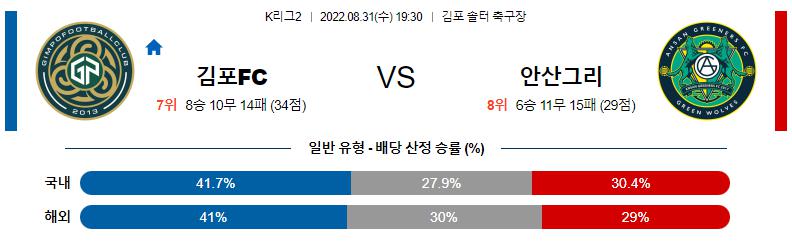 조민국 감독의 자진 사퇴 후 7월 중순부터는 나름대로 좋은 성적을 거뒀지만, 8월 초 서울이랜드와의 무승부를 시작으로 4경기째 승리가 없다. 특히, 최근 원정 3경기에서도 승리가 없다. 특히, 최근 수비적으로 다시 불안해진 모습. 앞선 리그 4경기 중 3경기에서 멀티 실점을 허용했다. 하위 전력임에도 다소 공격적인 기조로 경기 운영을 펼치는데, '좌-우 풀백' 이준희(DF)와 아스나위(DF)도 다소 높은 위치까지 올라가 공격에 가담하는 경향이 있습니다. 이로 인해 수비 뒷공간이 꽤나 넓어지는 편. 김포도 윤민호(FW), 손석용(FW)과 같이 역습 '한 방'을 꽂아 넣을 수 있는 전력들을 보유한 관계로 이번 일정도 실점 가능성이 높겠다.