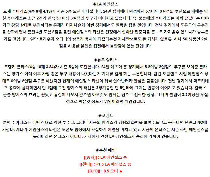 ◦ 엘지 LG 트윈스 (68승 1무 42패 / 리그 2위) 선발 평가 / ★★★ : 이민호 (20경기 10승 5패 ERA 5.42) 지난 경기에서는 한화를 상대로 5이닝 2실점을 기록하면서 두 자릿 수 승리를 거둔 투수가 될 수 있었다. 잘 던지는 날과 아닌 날의 차이가 큰 선수인데, 지난 경기에서는 계속 커맨드가 흔들리면서 불안했음에도 수비의 도움…