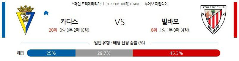 후술하겠지만, 빌바오가 시즌 초반 다득점을 기록하고 있지는 못하다는 점을 고려하면 언더(2.5 기준)의 가능성이 높겠다. 또한 카디스는 이번 시즌 리그 최악의 공격력을 보여주는 전력. 유일한 무득점 팀이다. 특히 전방 전력들의 경기 영향력이 부족하다. 반면 빌바오는 이번 시즌 초반 2경기 연속 무실점을 기록하며 이들의 강점을 여실히 보여주고 있다. 직전 경기에서는 상대에게 단 1개의 유효슈팅도 허용하지 않았다. 이번 일정도 빌바오의 승리가 예상된다.