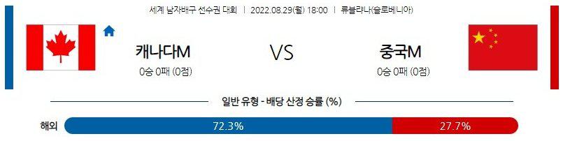 캐나다의 우세가 예상되는 경기다. 캐나다는 지난 이탈리아전에서 0:3으로 패배했으나 3세트에는 저력이 있다는 것을 증명했다. 리시브가 불안하긴 하나 중국의 서브 능력으로는 캐나다의 리시브를 공략하기 힘들다. 중국의 공격력이 상승하지 못할 것으로 보이는데다 -1.5의 핸디는 공략하기 힘들 것이다.