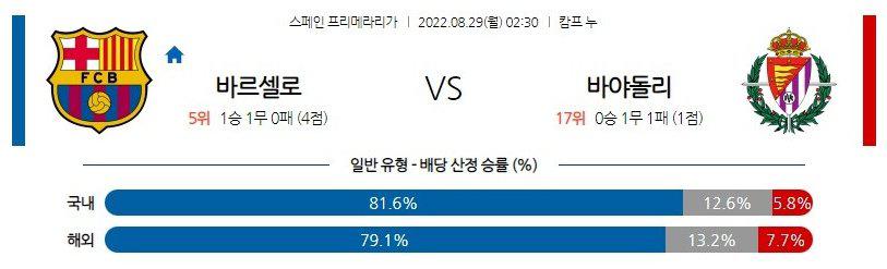후술하겠지만, 바르셀로나는 앞선 소시에다드 원정 경기에서 4골을 퍼붓는 괴력을 발휘하며 대승을 거뒀다. 특히, 세계 최고의 스트라이커라고 불리는 레반도프스키(FW)는 멀티골을 집어넣었다. 반면, 바야돌리드는 2경기 연속 실점을 허용하는 등 초반부터 수비 균열이 일어나고 있고, 특히나 상대의 PK박스 진입을 전혀 제어하지 못하고 있다. PK박스 진입에 큰 무리가 없는 바르셀로나의 핸디캡 승리(H-1.0) 까지도 충분히 가능할 전망. 여기에 오버(3.5 기준)까지도 겸하는 편이 좋겠다.