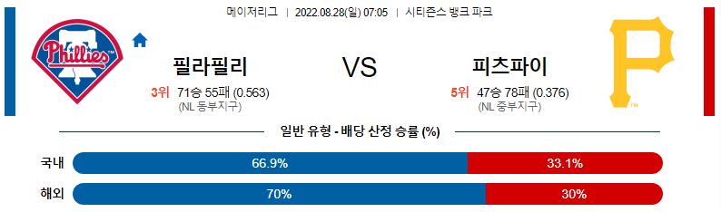 필라의 승리를 본다. 최근 놀라 못지 않은 안정적인 페이스를 보여주는 깁슨이 홈에서 나서기에 선발의 우위를 확실하게 기대할 수 있습니다. 피츠버그는 믿기 어려운 비디의 등판일인데다가 마무리를 제외하면 불펜이 약하기에 투수 운용에 어려움을 겪을 것입니다. 필라 타선이 살아난 점도 고려해야한다.