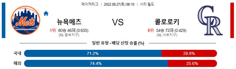 메츠의 승리를 본다. 디그롬과 맥스 셔저등 원투펀치보다도 배싯은 최근 좋은 피칭을 하고 있습니다. 8월의 투수로 뽑힐 가능성도 큰 투수로 콜로라도 타선을 홈에서 압도할 것입니다. 원정에서 부진한 콜로라도 타선과 달리 메츠는 현재 리그에서 득점 기대치가 가장 높은 팀이기도 하다. 콜로라도의 빈타 속에 언더 경기다.