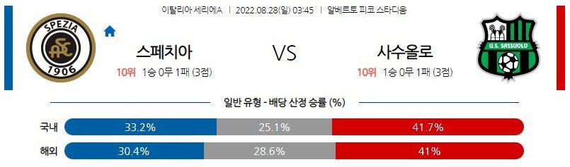 양 팀의 최근 4차례 맞대결 주소모두 오버(2.5 기준)가 나온 점을 고려하면 이번 일정도 오버(2.5 기준) 가능성이 높겠다. 또한 스페치아는 개막전 승리를 거두며 좋은 출발을 보였으나, 직전 경기에서 수비 쪽 불안감을 제대로 노출하며 대패를 당했다. 특히, 아직까지 신임 고티 감독의 색채는 확실하게 입혀지지 않은 모습. 반면 사수올로는 개막전에서 패배를 당했으나, 2R에서 승리를 거두며 분위기 전환에 성공했다. 특히, ‘핵심 2선 ’베라르디(FW)가 점점 살아나고 있다. 이번 일정도 사수올로의 승리를 예상한다.