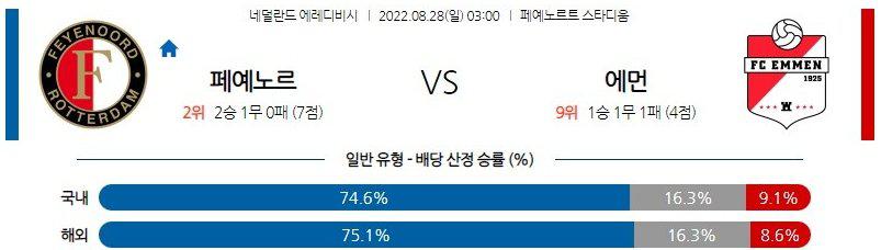 양 팀의 최근 5차례 맞대결 중 4번의 다득점 페이스가 나온 점을 고려하면 이번 일정도 오버(3.5 기준) 가능성이 높겠다. 또한 페예노르트는 이번 시즌을 앞두고 대대적인 공격진 개편이 있던 전력. 다만, 우려와는 다르게 초반 나름대로 뛰어난 공격 전개와 득점력을 보여주는 중이다. 반면 에멘은 지난 시즌 2부리그 최소 실점 팀이었지만, 1부리그에서는 수비력이 통하지 않는 모습. 특히나, 주장인 벨트메이트(DF)는 더 이상 전성기의 기량이 아니다. 이번 일정도 페예노르트의 승리가 예상된다.