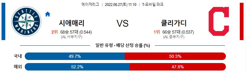 언더를 가져가야 한다. 길버트와 비버는 나란히 팀의 1선발 역할을 하는 투수로 쉽게 무너지지 않을 것입니다. 클블의 승리를 본다. 길버트는 최근 페이스 하락이 있습니다. 8월 엄청난 피칭으로 달려가는 비버가 더 안정적으로 본인의 경기를 책임질 수 있습니다. 또, 시애틀은 장타가 안 나오면 득점이 쉽지 않은 최근입니다. 로사리오와 네일러, 콴등이 충분히 출루해주는 클블이 승리할 것입니다.