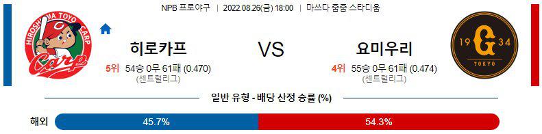 8월26일 NPB 일본 프로야구 히로시마 도요카프 요미우리 자이언츠 경기분석을 시작하겠습니다. 이번경기는 오후 6시에 시작이 되는 경기로서, 히로시마가 마츠다 스타디움에서 요미우리를 맞이하게 됩니다. 히로시마 도요카프 요미우리 자이언츠 두 팀이 센트럴리그에 속해있는데,히로시마가 5위를 기록중이고 요미우리가 6위를 기록중입니다.