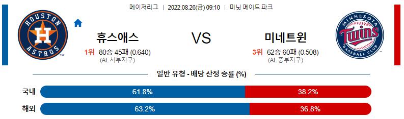 휴스턴의 승리를 본다. 가르시아가 부진한 최근이라 해도 미네 우타선 상대로는 강점을 보였고 홈의 편안함도 있습니다. 미네소타는 떨어지는 투수진의 힘을 타선의 파괴력으로 상쇄했는데 최근 타선 부진 속에 승률을 깎아먹고 있습니다. 아처가 안정적으로 이닝을 소화할 투수가 아니라는 점도 감안해야 한다. 휴스턴의 다득점 속에 오버 경기다.
