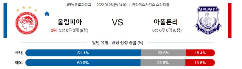 올림피아코스가 최근 치른 공식 4경기 중 3경기에서 언더(2.5 기준)가 나온 점을 고려하면 이번 일정도 언더(2.5 기준) 가능성이 높겠습니다. 또한 올림피아코스는 이전 원정 경기에서 무승부를 거두기는 했으나, 선발 데뷔전을 치른 ‘주력 중원’ 황인범(MF)의 가능성을 확인했던 경기로, 수확이 없던 것은 아니었다. 이번 일정은 홈 일정이기도 하며, 숱한 유럽대항전 경험을 살린다면 승리가 가능할 것으로 보입니다.