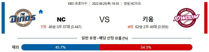 8월25일 KBO 한국 프로야구 NC 다이노스 키움 히어로즈 경기분석입니다. 오후 6시 30분에 시작이 되는 이번경기로서는 NC 다이노스의 홈경기로 진행이 되는 경기입니다. NC 다이노스는 7위를 기록중이고 키움은 4위를 기록중인데 , NC 다이노스 키움 히어로즈 두 팀의 최근 전력에서는 오히려 NC가 우세합니다.