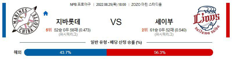 8월25일 지바롯데 마린스 세이부 라이온즈 NPB 일본 야구 분석입니다. 이번경기는 오후 6시에 시작이 되며 지바롯데의 홈에서 진행이 됩니다. 지바롯데 마린스 세이부 라이온즈 두 팀은 퍼시픽 리그에 속해있는데, 지바롯데느 51승58패를 기록중이고 세이부는 61승51패를 기록중입니다.