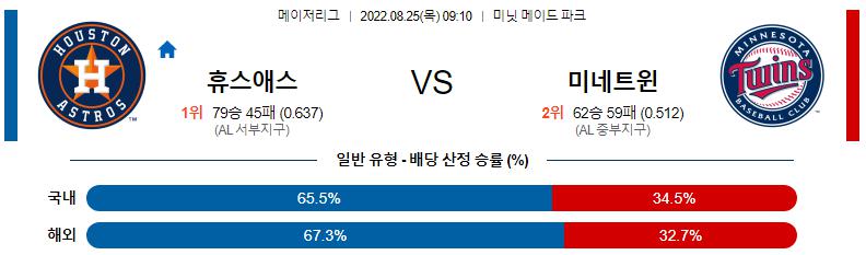 휴스턴의 승리를 본다. 미네소타 타선은 미란다와 산체스, 코레아등 좌투수에 강한 타자들이 즐비하다. 그러나, 리그에서 가장 안정적인 이닝 소화를 하며 연속경기 qs 기록을 써내려가는 발데즈를 만나는 것은 부담입니다. 만치니가 중심타선에 확실히 자리잡으며 좌우 균형이 좋아졌고 알튜베가 번디를 공략할 휴스턴이 승리할 것입니다. 휴스턴의 다득점 속에 오버 경기다.