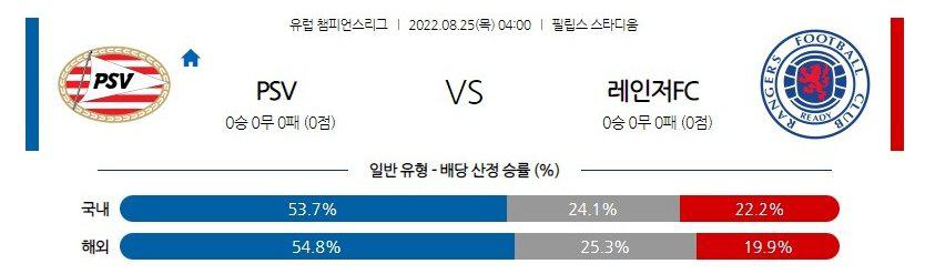 직전 맞대결에서 봤듯이 막강한 화력을 바탕으로 한 두 팀의 대결인 만큼 오버(2.5 기준)를 필히 겸하자. 다만 압도적인 레인저스 원정경기에서도 PSV의 제공권을 활용한 ‘득점 루트는 ’큰 효과를 봤던 상황. 만만치 않은 홈 분위기를 자랑하는 PSV가 홈 이점을 살려 선전할 것으로 기대되는 바이다. 특히 레인저스의 ‘핵심 2선 ’하지(CAM)의 부상 이탈로 팀의 창의성이 감소해 PSV의 지공을 뚫어낼 수 있을지도 의문이다.
