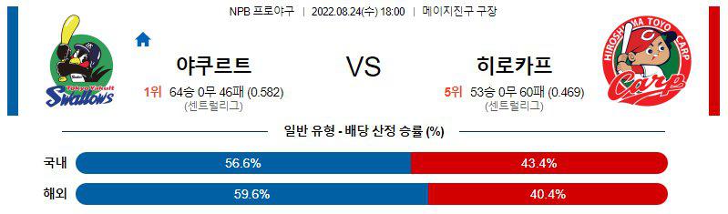 8월24일 야쿠르트 스왈로스 히로시마 도요카프 NPB 일야 분석입니다. 이어질 경기는 오후 6시에 시작이 되는 경기인데, 야쿠르트가 홈에서 히로시마를 맞이하게되는 경기입니다. 야쿠르트 스왈로스 히로시마 도요카프 두 팀이 센트럴리그에 속해있는데, 야쿠르트는 1위를 기록중인 팀이고 히로시마는 4위를 기록중인 팀입니다.