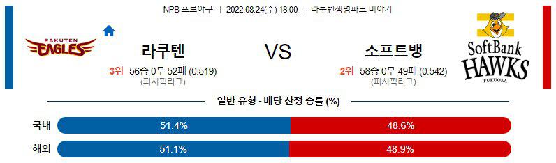8월24일 NPB 일본 프로야구 라쿠텐 골든이글스 소프트뱅크 호크스 분석입니다. 오후 6시에 시작이 되는 이번경기는 라쿠텐 생명파크에서 진행이 되는 경기입니다. 라쿠텐 골든이글스 소프트뱅크 호크스 두 팀이 퍼시픽리그에 속해있는 가운데 라쿠텐은 56승51패로 3위를 기록중이고 소프트뱅크는 60승51패로 1위를 기록중입니다.