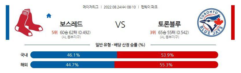 토론토의 승리를 점치겠다. 일단 스트리플링이 복귀전에서 땅볼 유도 능력을 잘 보여주면서 분위기를 반전시켰다는 점이 가장 큰 요소. 전반적으로 윈코우스키보다는 스트리플링이 장타 허용에서 더 자유로운 선수라고 볼 수 있고, 올 시즌 홈/원정 스플릿도 크지는 않은 편이다. 다만 앞서 언급했듯이 스트리플링이 보스턴 홈 구장에서는 다소 부진하다는 점을 고려해야 하고, 보스턴의 불펜 상황도 이번 달 썩 좋지 않음을 고려한다면 오버를 주력으로 삼는 것도 괜찮다.