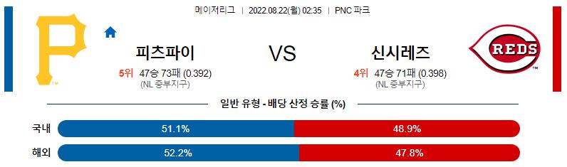 마이크 마이너(1승 10패 6.31)가 시즌 2승 도전에 나선다. 16일 필라델피아와 홈 경기에서 5이닝 10안타 4실점의 부진으로 패배를 당했던 마이너는 8월 한달간 3패 6.32로 투구 내용이 극도로 나쁜 편입니다. 피츠버그 상대로도 7월 8일 홈에서 6.1이닝 4실점 패배를 당했던 터라 일단 5이닝을 어떻게든 3실점 이내로 막아보는게 최선일수도 있습니다. 전날 경기에서 비디와 스타웃을 무너뜨리면서 프렐리의 2점 홈런 포함 무려 10점을 올린 신시내티의 타선은 이 파괴력이 1회성으로 끝나지 않아야 한다. 그러나 15타수 7안타의 득점권 성적은 확실히 비정상적입니다. 4이닝을 1안타 무실점으로 막은 불펜은 오래간만에 제 몫을 해낸듯 하다.