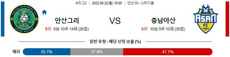 8월22일 안산 그리너스 충남 아산 K리그2 한국 프로축구 경기분석입니다. 오후 7시에 시작이 되는 이번경기로서는 안산 그리너스의 홈에서 진행이 되는 경기입니다. 안산 그리너스는 6승10무14패를 기록하고 있고 충남 아산은 10승9무10패를 기록하고 있는데 안산 그리너스 충남 아산 두 팀의 전력에서는 충남아산이 좀더 우세할것으로 보입니다.