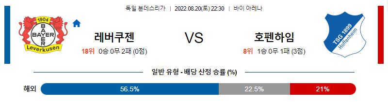 개막전에서 다소 어려운 상대인 묀헨글라드바흐를 만나 1-3 패배를 당했으나, 이전 보훔과의 경기에서 신승을 거두며 리그 첫 승을 신고했습니다. 신임 브라이텐라이터 감독의 색채가 조금씩 입혀지고 있는 모습.호펜하임은 이전 시즌 4백을 주로 사용했으나, 브라이텐라이터 감독 부임 후 이번 시즌부터 3백으로 경기에 나서고 있습니다. 특히나, 다소 공격적인 모습을 보여주는 ‘좌-우 윙백’ 앙헬리뇨(DF)와 스코프(MF, 최근 2경기 1골)를 적극적으로 활용하는 패턴. 이로 인해 앞선 2경기에서 4골을 기록하는 공겨격을 보여줬다. 하지만, 아직까지 수비는 불안한 편. 새롭게 팀에 합류한 은소키(DF)와 카박(DF)은 적응이 덜 된 모습이며, 3백의 중심을 잡아주는 보그트(DF)마저 부상으로 출전이 불투명합니다. 비록 레버쿠젠이 시즌 초반 득점을 기록하는 데 어려움을 겪고 있으나, 실점 가능성은 다분히 높겠습니다.