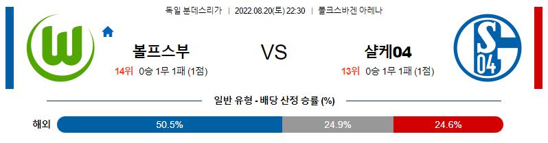 이전 시즌 이후 재건 전문 감독인 코바치 감독을 선임했고, 프리시즌에서 좋은 경기력을 보이며 다가오는 시즌에 대한 기대감을 높였다. 그러나 뚜껑을 열어놓고 보니 아직까지 감독의 색채가 입혀지지 않은 모습. 개막전 무 승부를 포함해 1무 1패를 기록 중입니다.그래도 이전 경기에서 ‘극강’ 바이에른 뮌헨을 상대로 나름 선전했습니다. 중앙에 많은 숫자의 선수를 포진시켜 강력한 블록을 형성한 후 상대 공격을 막아냈다. 수비적인 조직력은 점점 좋아지는 모습. 자신이 그동안 잘 해 왔던 날카로운 역습 전개는 아직까지 이뤄지지 않고 있으나, 샬케가 매우 불안한 수비를 보이고 있다는 점을 고려하면 이번 일정에서는 최소 1실점 내외로 틀어막은 후 득점까지 가능할 것으로 보인다. 특히, 볼프스부르크는 과거 샬케에게 특히나 강한 모습을 보였다는 점도 참고하면 좋다.