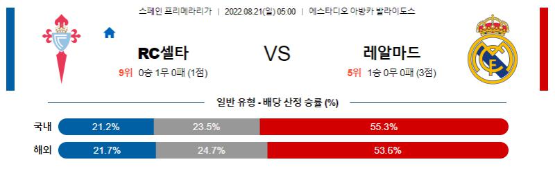 역시 유럽 최강의 팀 답게 시즌 초반 공식 2경기에서 2연승을 기록 중. 이전 경기에서 승격 팀 알메리아의 기세에 눌려 선제 실점을 허용했으나, ‘강팀의 조건’을 갖춘 팀 답게 역전에 성공하며 개막전을 승리로 장식했다. 다양한 공격 패턴을 갖춘 것이 가장 큰 강점. 기본적으로 ‘비-벤 라인’의 비니시우스(FW), 벤제마(FW)의 개인 드리블, 패스 네트워크를 통한 공격이 매우 위협적이며, 여기에 미드필더들의 중거리 슈팅 능력, 코너킥과 프리킥까지 세트피스 상황에서도 꾸준히 득점을 만들어내고 있습니다. 여기에 이전 경기에서 슈퍼컵의 여파로 인해 핵심 전력들에게 휴식을 부여했다. 이번 일정에서는 알라바(DF, 이전 경기 1골), 모드리치(MF), 카세미루(MF)와 같은 핵심 전력들이 주소모두 선발 출전할 예정. 셀타를 상대로 어렵지 않게 승리를 따낼 가능성이 높겠습니다.