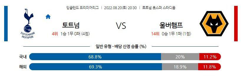 후술하겠지만, 개막전을 포함해 토트넘의 앞선 2경기에서 주소모두 오버(2.5 기준)가 나온 점을 고려한다면 이번 일정도 오버(2.5 기준) 가능성이 높겠다. 또한 토트넘은 시즌 초반 나름대로 무패를 달리며 순항하는 중. 특히나 2경기에서 6골을 터뜨리고 있는 득점력이 눈에 띈다. 반면, 울버햄튼은 시즌 초반 공, 수 모든 부분에서 문제를 겪으며 부진을 거듭하고 있는 상태. 이번 일정에서도 반전을 일으킬만한 가능성이 보이지 않는다. 토트넘의 승리가 예상된다.