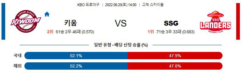 한국프로야구 키움 히어로즈 SSG 랜더스의 경기가 오는 토요일(8/20) 14:00 키움의 홈 구장인 고척 스카이 돔 구장에서 열릴 예정입니다. 키움 히어로즈 SSG 랜더스 양 팀 간의 이번 주말 2연전 가운데 첫번째로 펼쳐지는 경기인데요 양 팀의 이번시즌 맞대결 경기에서는 SSG이 8승3패로 압도적인 우위를 보이고 있습니다.