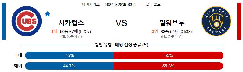 8월 20일 03:20 MLB C.컵스 : 밀워키 MLB분석