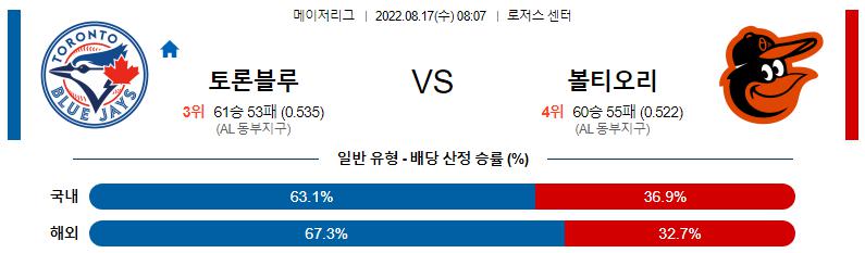 8월 17일 08:07 MLB 토론토 : 볼티모어 MLB분석