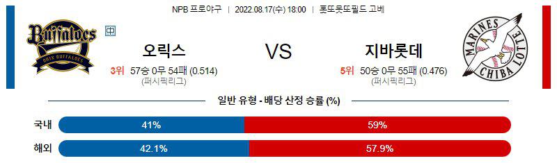 일본프로야구 퍼시픽리그 오릭스 버팔로스 지바롯데 마린스의 경기가 오는 수요일(8/17) 18:00 오릭스의 홈 구장인 홋토모토 필드 고베에서 열릴 예정입니다. 오릭스 버팔로스 지바롯데 마린스 양 팀 간의 이번 주중 3연전 가운데 두번째로 펼쳐지는 경기입니다.