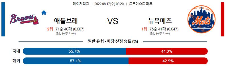 8월 17일 08:20 MLB 애틀랜타 : 뉴욕 메츠 MLB분석