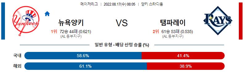 8월 17일 08:05 MLB 뉴욕 양키스 : 탬파베이 MLB분석