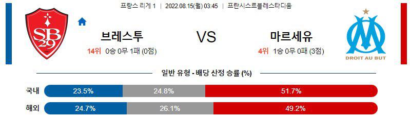 마르세유의 승리를 본다. 1패를 안고 있는 브레스트가 홈에서 라인을 내리지 않고 경기에 나설 것으로 보이는데 그로 인해 더 어려운 경기가 예상된다. 귀엥두지와 베레타우트등 공수 밸런스가 좋은 선수들이 투볼란치로 나설텐데 공격적으로 임할 상대의 뒷공간을 파고들 선수들에게 A패스를 넣어줄 수 있습니다. 또, 파예와 윈데르등 스스로 해결할 2선의 골도 기대되는 마르세유가 연승에 성공할 것입니다.