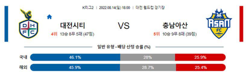 대전이 용병들을 필두로 공격력이 살아나고 있다는 점, 충남아산이 최근 두 경기 연속 멀티 실점을 허용할 정도로 수비가 불안하다는 점을 고려하면 오버(2.5 기준) 가능성이 높겠다. 또한 대전의 최근 페이스는 좋은 편. 특히나, 홈에서는 무패 행진을 달리고 있다. 반면 충남아산은 체력적인 부담을 느끼며 시즌 첫 연패를 기록했다. 특히나 용병들이 맹활약하고 있는 대전과 용병 하나 없는 충남아산의 스쿼드는 더욱더 비교가 된다. 이번 일정도 대전의 승리가 예상된다.