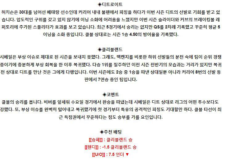 ◈디트로이트 개럿 힐(2승 3패 5.12)이 시즌 3승에 도전합니다. 7일 템파베이와의 홈경기에서 5.2이닝 6안타 1실점의 호투로 승리를 거둔 힐은 근 5경기만의 호투를 이번 경기에서 이어가느냐가 관건입니다. 금년 클리블랜드 상대로 데뷔전에서 잭 플리색을 상대로 6이닝 2안타 1실점 승리를 거둔 기억이 있는데 그 데뷔전이 낮경기였음을 감안한다면 …