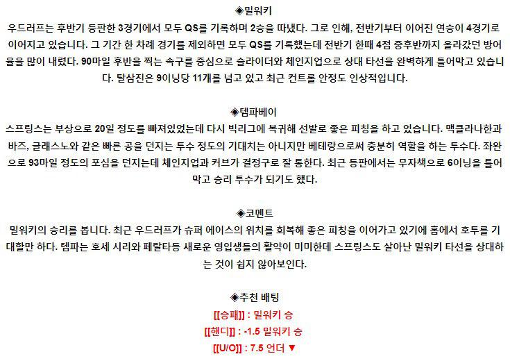 ◈캔자스시티 잭 그레인키(3승 7패 4.58)가 시즌 4승 도전에 나선다. 6일 보스턴과의 홈경기에서 4.2이닝 4실점의 부진으로 패배를 당한 그레인키는 역시 홈이라고 해도 상대적 강팀 상대로는 통하지 않음을 여실히 드러낸바 있습니다. 금년 화이트삭스에게 홈에서 5.2이닝 2실점 투구를 해냈었는데 낮 경기에 강한 투수임을 감안한다면 일단 기대치는 …