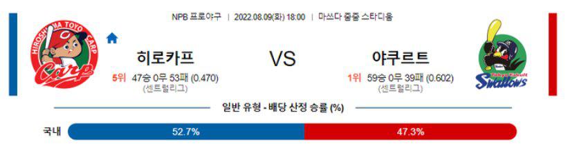 지난주 1승4패 성적을 기록한 히로시마와 3연패 흐름 속에 2승3패를 기록한 야쿠르트의 만남 이다. 올스타전에서 패배를 기록한 것이 모리시타 마사토 투수의 투구리듬에 악영향을 줬다는 것을 후반기 첫 등판에서 확인할수 있었다. 점검의 시간을 통해서 구위를 점검한 타카나시 히로토시 투수가 선발 싸움에서 밀리지 않는 경기다. 야쿠르트 승리 가능성을 추천 한다.