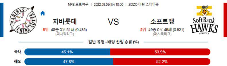 지난주 2승4패 성적을 기록한 지바롯데와 2승1무3패를 기록한 소프트뱅크의 만남 이다. 이전경기에서 니혼햄 상대로 5연승이 중단 되는 패배가 나왔지만 직전경기 라쿠텐 상대로 승리를 기록하며 상승세 리듬을 이어가게 된 애니 로메로 투수에 대한 기대치가 높은 선발 매치업 이다. 지바롯데 승리 가능성을 추천 한다.