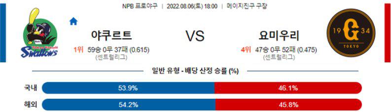 전일 경기에서 5-9, 패배를 당했지만 9회 4득점을 추격하며 경기를 마무리 했다는 것이 토요일 경기에서 야투르트 타선에 긍정적인 요소로 작용할 것이다. 또한, 선발 싸움에서 코자와 레이지 투수에 대한 기대치가 높다. 야쿠르트 승리 가능성을 추천 한다.