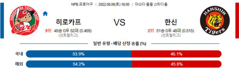 7연패에 빠진 히로시마가 연패에서 탈출할 것으로 예상되는 경기. 후지나미 신타로 투수가 무브먼트가 좋은 낙차 큰 커브를 주무기로 나쁘지 않은 탈삼진 능력을 선보였지만 원정에서의 고질적인 제구불안의 문제점은 유효하다고 생각된다. 올시즌 상대전 짠물투구의 연속 이였던 드류 앤더슨 투수를 믿어보자. 히로키프 승리 가능성을 추천 한다.