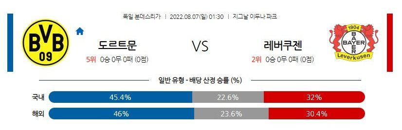 양 팀의 최근 5차례 맞대결 주소모두 다득점 페이스가 나온 점을 고려하면 이번 일정도 다득점 페이스가 유력하겠다. 또한 도르트문트는 최전방에 홀란드를 이적시키며 알레를 데려왔으나, 부상으로 인해 스쿼드에서 빠져 있는 상황. 전방에서의 공격은 경험이 많지 않은 어린 선수들이 채워야 하는 상태다. 여기에 레버쿠젠은 지난 시즌에 비해 큰 변화가 없지만, 앞선 포칼컵에서 3부리그 팀에게 4실점이나 허용하며 무너진 바 있으므로, 이번 일정에서도 승리까지 장담하기는 어렵겠다. 무승부를 예상한다.