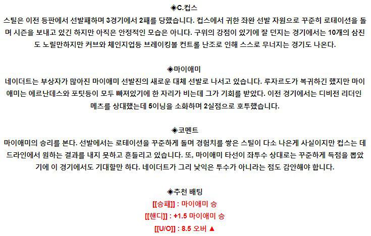 ◈오릭스 타케야스 다이치(2.00)가 시즌 첫 승에 재도전한다. 21일 니혼햄과의 홈경기에서 5이닝 2실점의 투구를 보여준 타케야스는 피홈런 1발이 아쉬움을 많이 남겼다. 2주일만의 재대결이고 그때와 투수도 폰세로 같은데 비슷한 투구를 보여줄 가능성이 높다. 전날 경기에서 무수한 찬스를 날려버리면서 단 2점을 올리는데 그친 오릭스의 타선은 최근 중심…