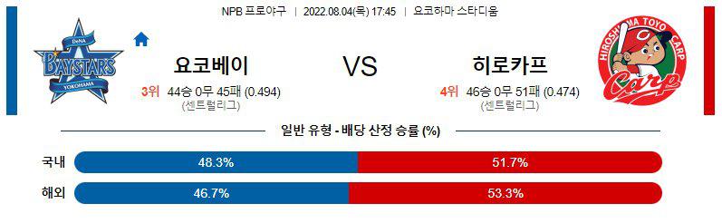 8월4일 NPB 일본 프로야구 요코하마 베이스타스 히로시마 도요카프 경기분석을 시작하겠습니다. 이번경기는 오후 5시 45분에 시작이 되는 경기인데, 요코하마가 히로시마를 홈에서 맞이하게되는 경기입니다. 요코하마 베이스타스 히로시마 도요카프 두팀은 센트럴리그에 속해있는데, 요코하마는 3위를 기록하고 있고 히로시마는 4위를 기록하고 있습니다.스포츠중계 쿨티비