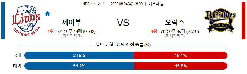 8월4일 세이부 라이온스 오릭스 버팔로스 NPB 일본 야구경기 분석입니다. 이어질 경기는 오후 6시에 시작이 되는 경기인데, 세이부가 홈에서 오릭스를 맞이하게되는 경기입니다. 세이부 라이온스 오릭스 버팔로스 두 팀은 퍼시픽리그에 속해있는데, 세이부는 1위를 기록하고 있고 오릭스는 3위를 기록하고 있습니다.