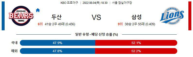 8월4일 두산 베어스 삼성 라이온즈 KBO 한국 야구 경기분석을 시작하겟습니다. 이번경기는 오후 6시 30분에 시작이 되는 경기로서 두산 베어스가 홈에서 삼성 라이온즈를 맞이하게되는 경기입니다. 두산 베어스 삼성 라이온즈 두 팀의 최근 전력에서는 큰 차이는 나지 않지만, 상대전적에서는 삼성이 우위를 점하고 있습니다. 스포츠중계