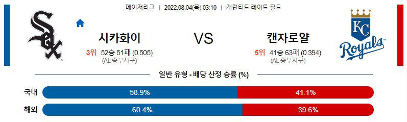【MLB】 8월 4일 시카고화이트 vs 캔자스시티